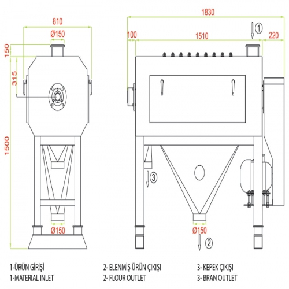 | Model | Ölçüler / Dimensiond (mm) | Elek Ölçüleri (mm)/Size of screen | Kapasite | Hava İhtiyacı | Güç | Ağırlık | ||||||||
