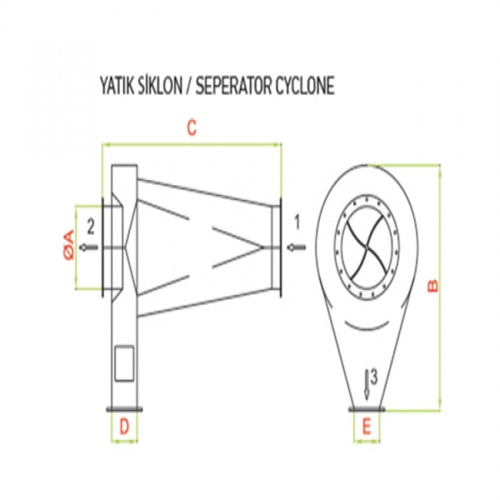A+ A- Yatık Siklon Model TypeOABCDEMANA-30300790915150120MANA-353509701035150120MANA-4040010901135150120 1-) TOZ GİRİŞİ2-) TOZ ÇIKIŞI3-) ATIK ÜRÜN ÇIKIŞI1-)DUST İNLET2-) DUST OUTLET3-) OTHER PRODUCT OUTLET